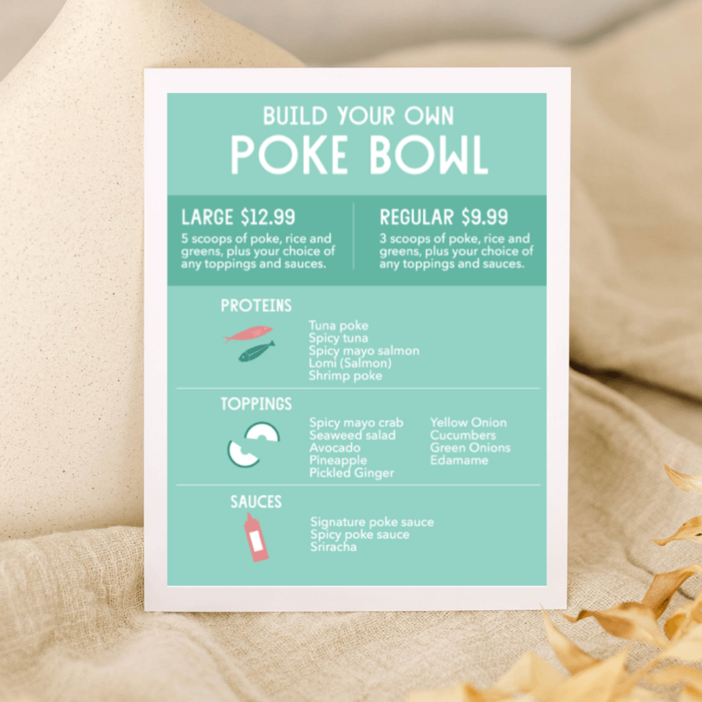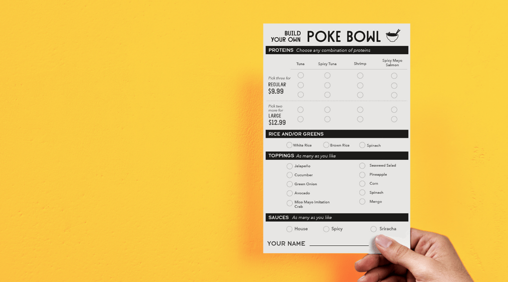 The poke station became a permanent fixture with extended hours. To alleviate some of the work on the team members, and reduce wait time for customers, I made a printable “sandwich-style” poke bowl card. The poke card allowed customers to put in their orders, walk away, and return to retrieve their finished bowls.
